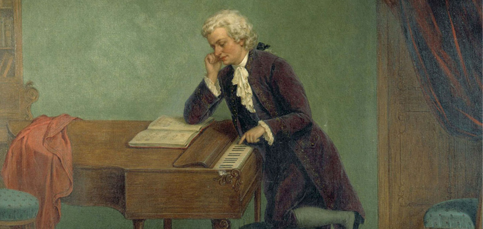 Первая страница партитуры, рукопись Моцарта; Возможно, самый последний прижизненный портрет Моцарта, написанный в 1790 году в Мюнхене. Художник Иоганн Георг Эдлингер